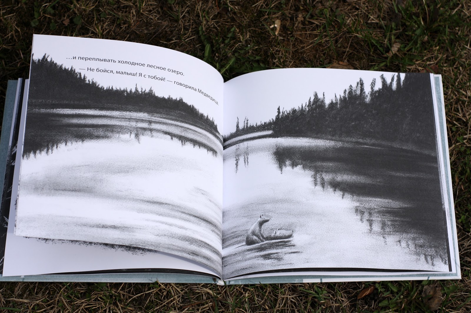 Эта красивейшая книга рассказывает о маме-медведице и её медвежонке, о смене времён года и о их медвежьей жизни в лесу. В ней очень мало текста, но тончайшие иллюстрации. Карандашная графика. Всего два цвета использовала художница - цвет угольного карандаша и белый фон бумаги, но смогла передать запах каждого сезона. У нас тоже очень долго было всего два цвета в природе - черный и белый и тот, что между ними. Но вот весна пришла. Она пришла! Я беру своего медвежонка и мы идём в парк. Парк уже не тот, что был в моём детстве.. Сейчас любят рубить деревья. Раньше там была настоящая Нарния. Мы с бабушкой прятались в тени тополиных крон от жары. Они были такими большими и ветвистыми, что смыкались у нас над головами. А сейчас там одни пни и аттракционы. Мы на пнях посидели и поснимали наши красивые книги, нашу радость. Трудно снимать книги, когда медвежонок так и норовит куда-нибудь убежать. То в дальний угол парка, то к реке - и выглянув в круглую дыру кованого ограждения смотреть, как течёт наша холодная река, течёт и впадает в другие реки, а потом в Северный Ледовитый океан. Но солнце светит, трава растёт, весна пришла. А за ней будет лето, короткое, но жаркое. И мне ещё многому предстоит научить медвежонка.